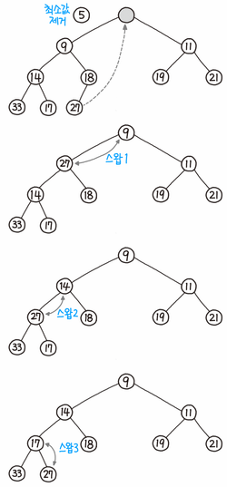 자녀노드인 (9) 가 더 작기 때문에 자녀위치와 루트노드를 교환한다.